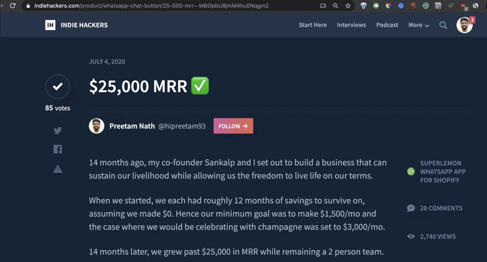 Super interesting that the milestone post did better on IndieHackers than the actual post. I thought a summary of the 11 lessons would do well. And funny enough, the post picked up more steam after 24 hours, once the milestone was no longer visible. I found it a bit odd.