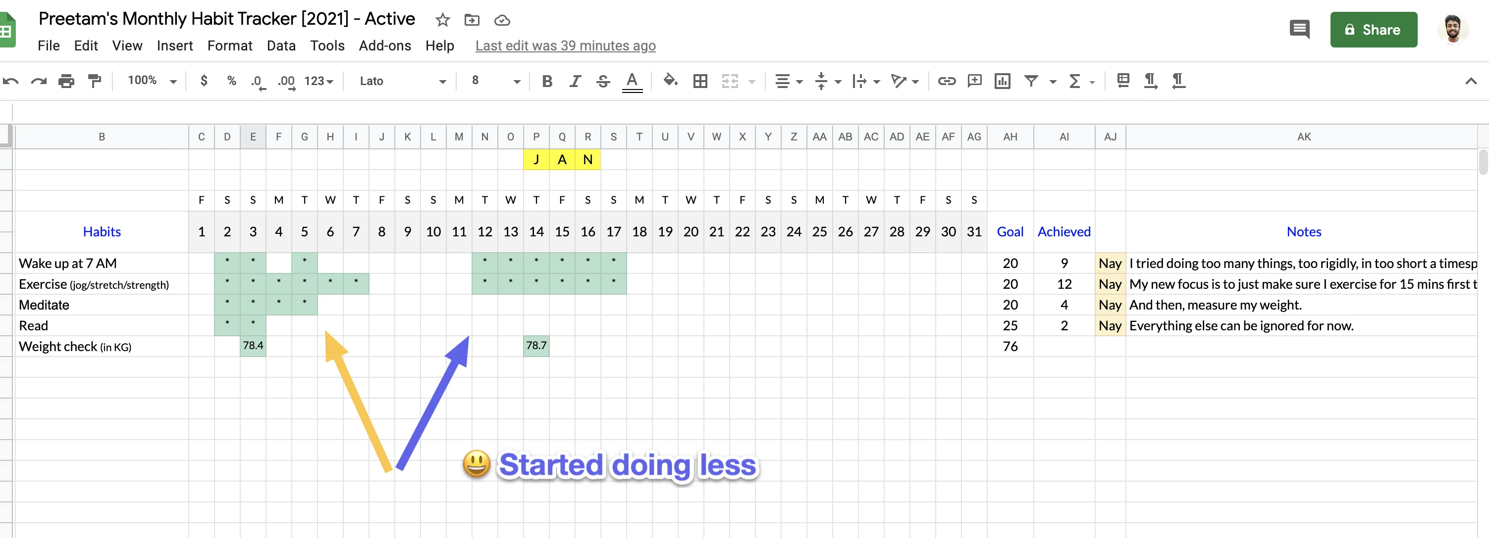 Screenshot from my habit tracker spreadsheet