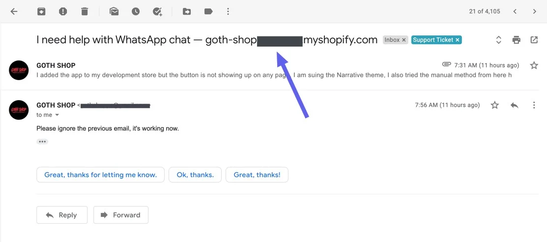We also made numerous smaller tweaks to optimise our support flow. One of the tiny but powerful tweaks was to automatically populate the email subject line with the user’s Shopify store url. That made it so much faster for us to look up the specific user instead of a meaningless back and forth of “what’s your store url”.