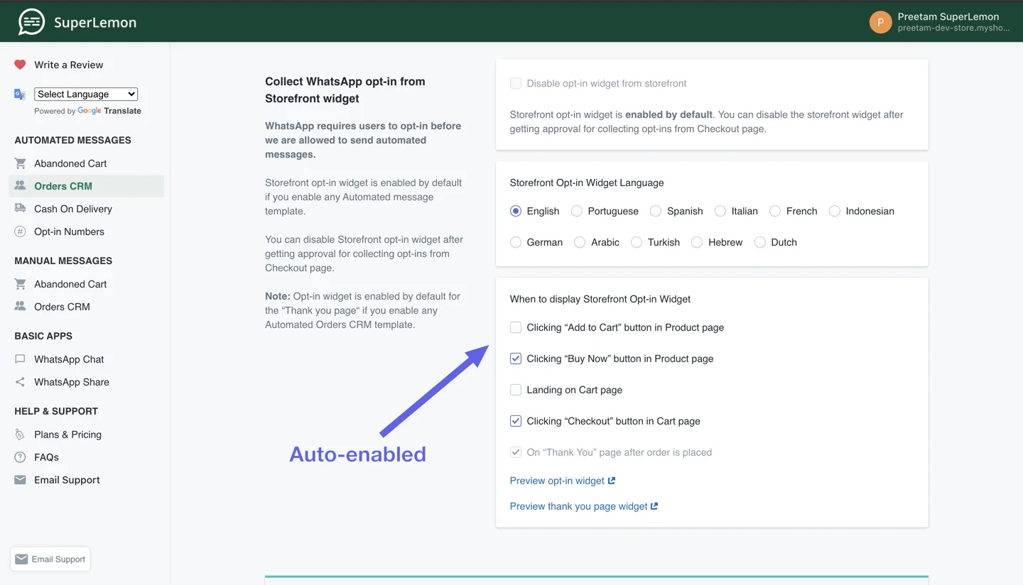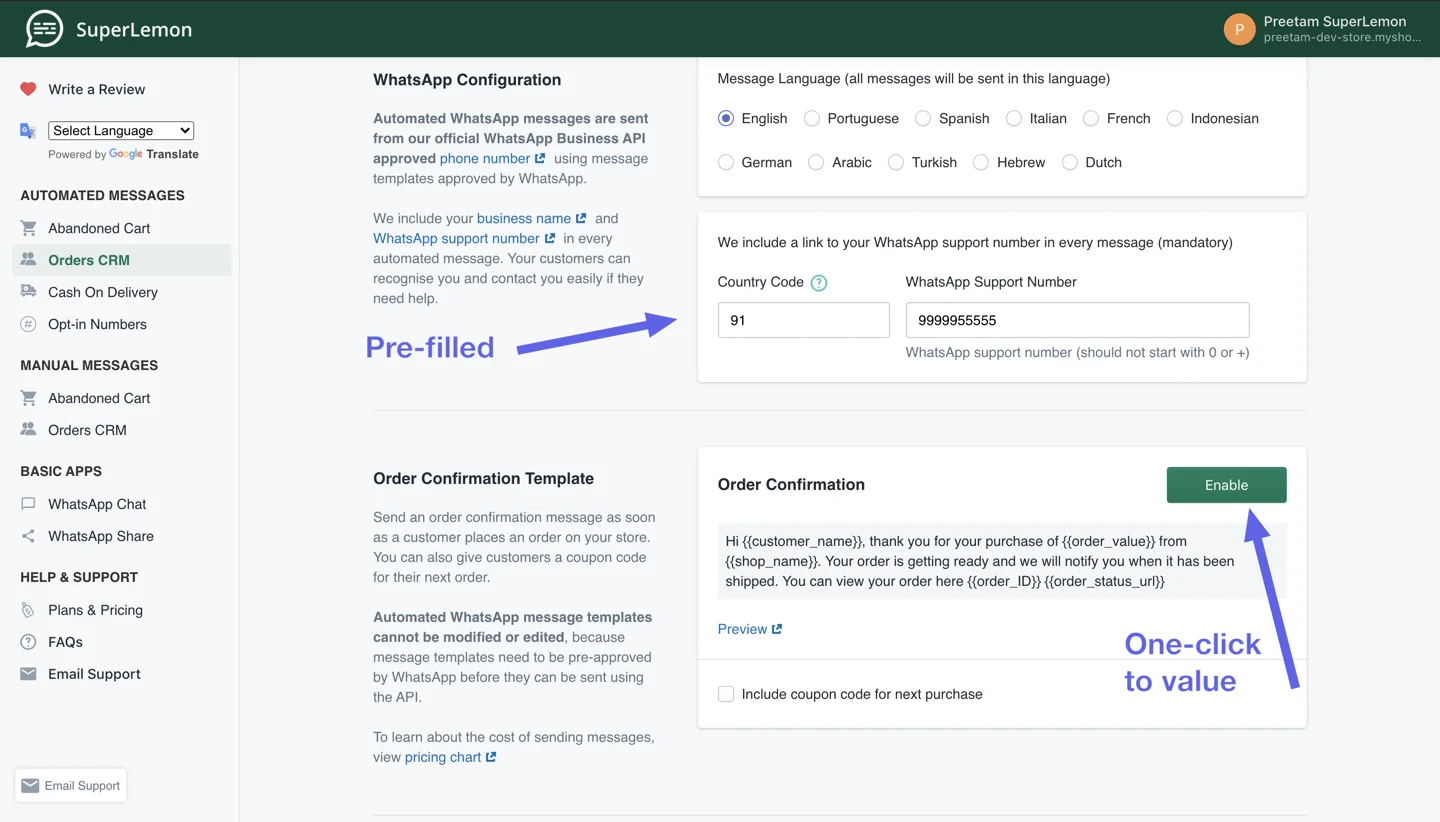 Another example, when a user wants to start sending automated messages, all they have to do is click on the “Enable” button. All the app’s default configuration is automatically applied and the user can start seeing value immediately.
