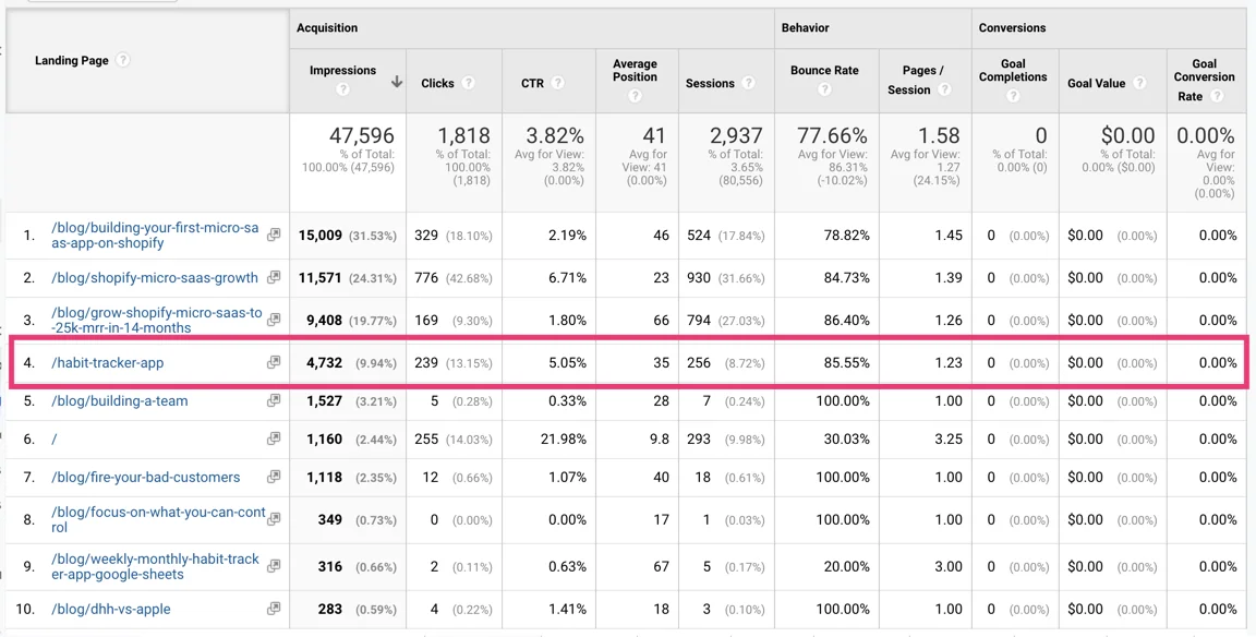 Since then, my habit tracker landing page has garnered 4,700+ impressions and 239 clicks directly from Google Search. This is completely on autopilot, I’ve never updated the page since I first posted.