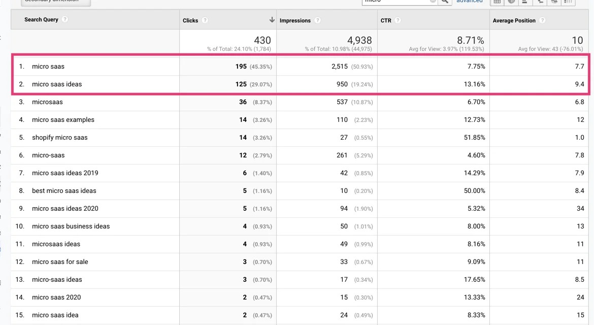 - Which search terms related to “Micro SaaS” is my blog already ranking.