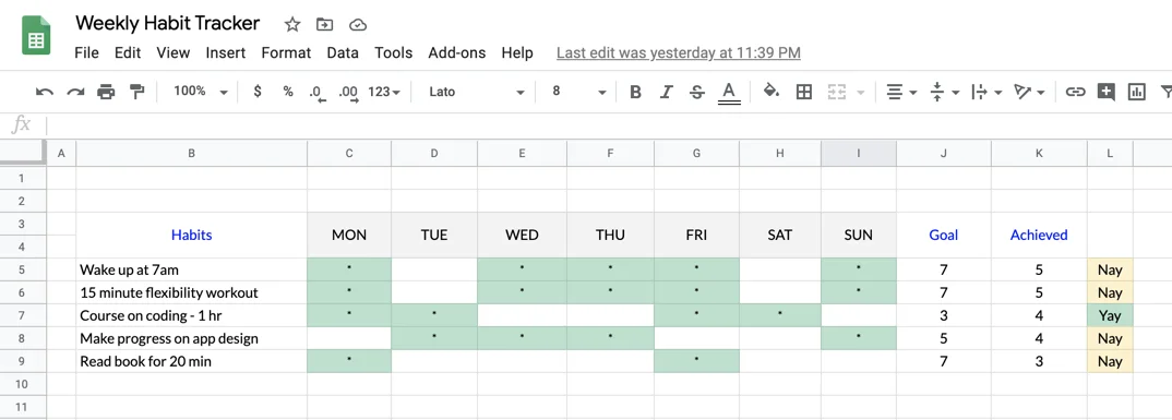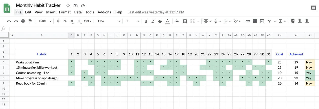 - The "Achieved" column will automatically count number of times you perform a habit, and will give you a Yay or a Nay based on whether you achieved your goal.