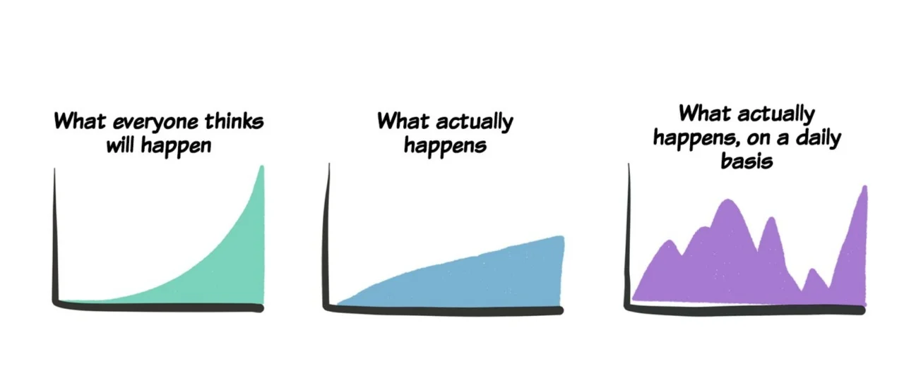 You're not going to get rich in one day, or month, or even a year. In reality, the journey is going to look like this: