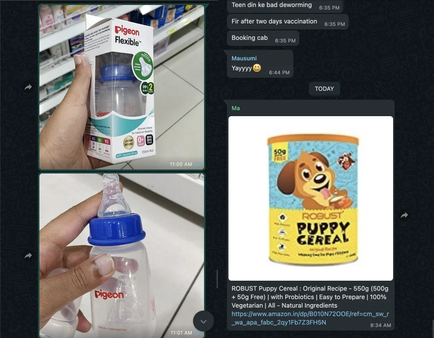 Conversations in my family's WhatsApp group have shifted since Doggo came to live with us. That's me buying a feeding bottle at the supermarket.